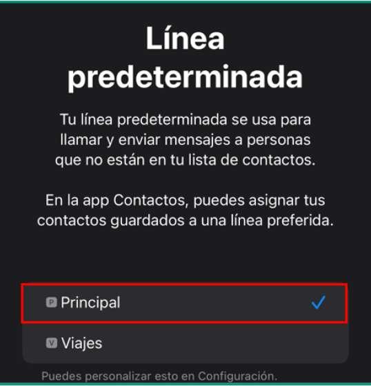 Llegarás al menú titulado 'Línea predeterminada'. Selecciona la opción 'Principal' y después presiona 'Continuar'.